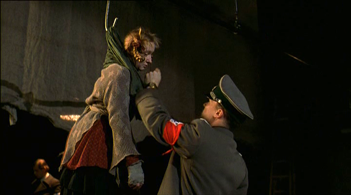 But here, Gestapo chief Kittel, a 22 year old who is fond of the piano and pretty good on the saxophone, uncovers a bean thief and promptly sentences her to death. He is clearly a lover of music and art on one side, but a sadistic Nazi on the other. Art wins out, and he allows the bean thief to make it up to him by performing. The bean thief just happens to be a famous stage performer named Hayyah. Kittel lusts for her, it is clear, so he allows the theater to open in order to perform, which provides a stage on which he can entertain his carnal desires – all under the guise of letting Hayyah pay back the bean debt.